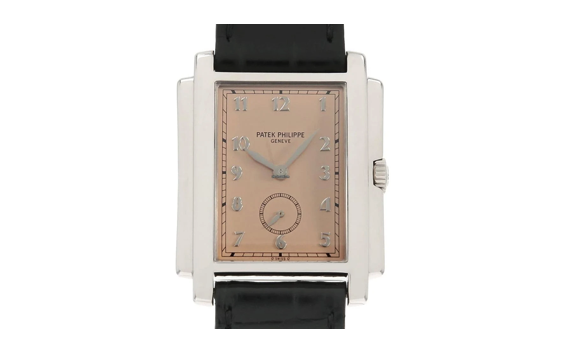 The Patek Philippe Gondolo 5024G-001 embodies timeless Art Deco elegance and refined craftsmanship. Encased in 18K white gold, this rectangular masterpiece features a rare pink salmon dial adorned with Breguet numerals, exuding understated sophistication and classic Patek charm.