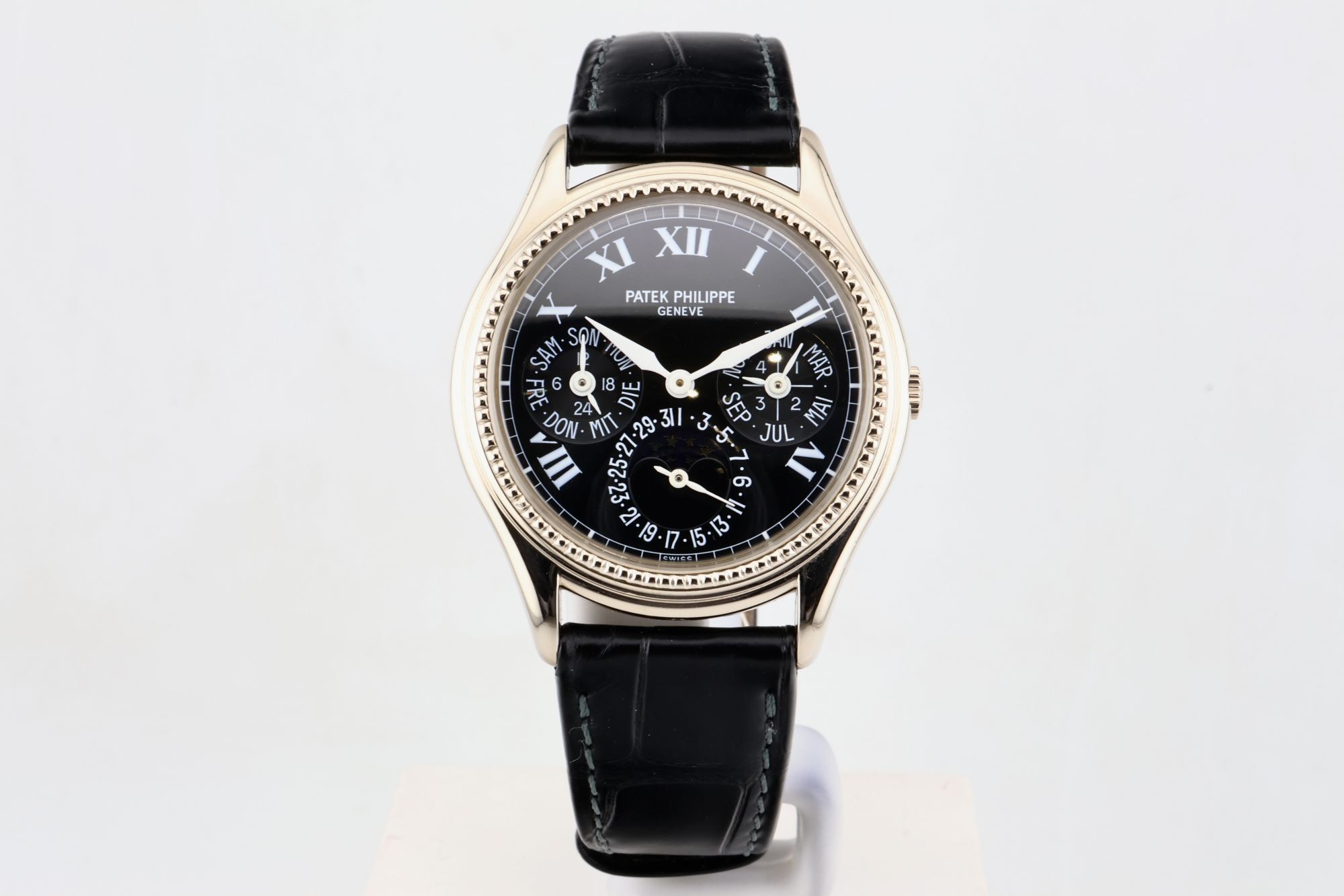 A rare and elegant Patek Philippe 5038G Perpetual Calendar, produced in a limited series of only 500 pieces. Crafted in white gold, it features a refined black dial with moonphase and calendar complications — a timeless expression of Patek Philippe’s mastery.