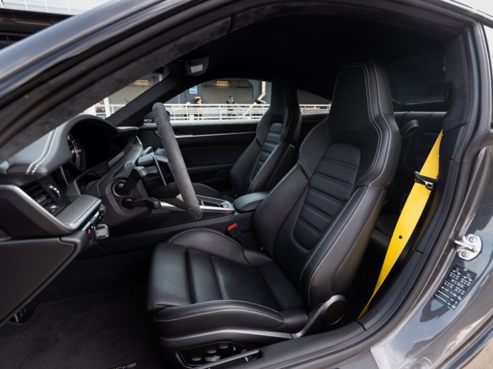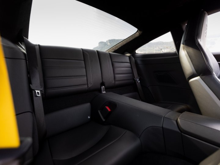 Interior: Black leather with contrasting silver stitching, yellow seat belts