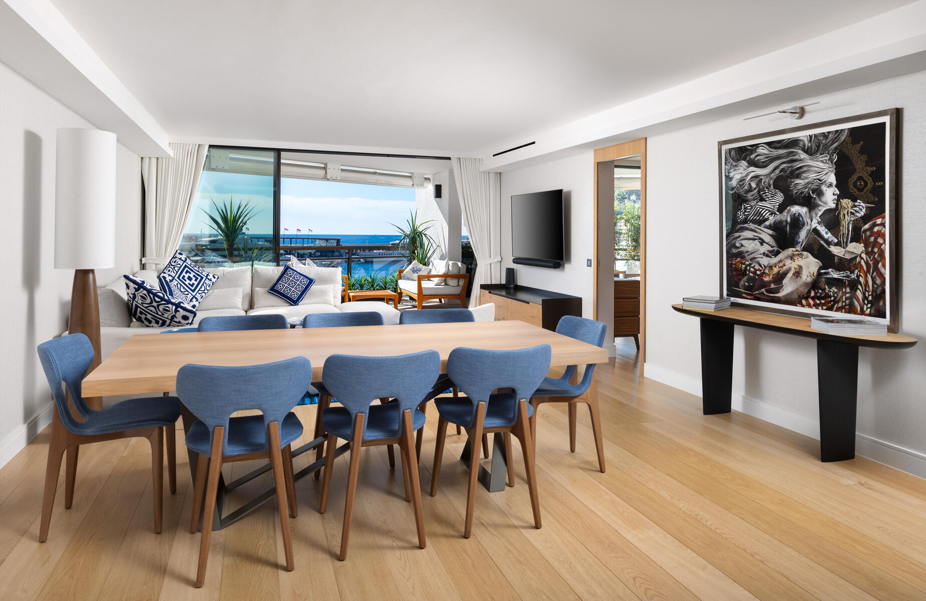 Fully furnished and ready to move into, the apartment features an elegant entrance hall with bespoke storage, a state-of-the-art Poggenpohl kitchen with Miele appliances, breakfast island, and bar with wine chiller. The open-plan dining and living area, with Sonos sound system, opens onto a spacious terrace boasting panoramic views over Port Hercules, the Palace, and the Mediterranean.