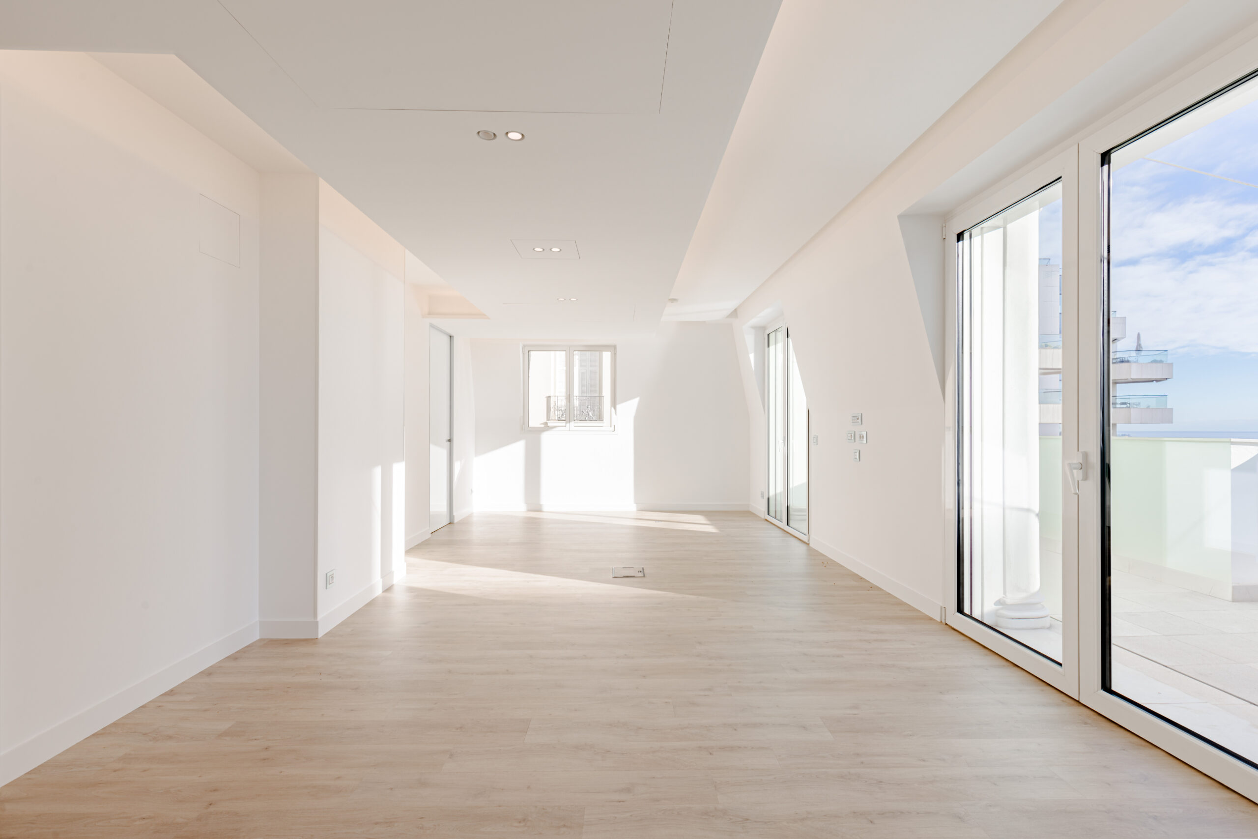 The bright living and dining area opens onto a spacious terrace with panoramic sea views. The Bulthaup kitchen is fully equipped with Neff appliances and integrated TV. The master suite includes a private terrace, custom-lit closets, and a luxurious en-suite bathroom with double shower, bathtub, and mirror TV.
