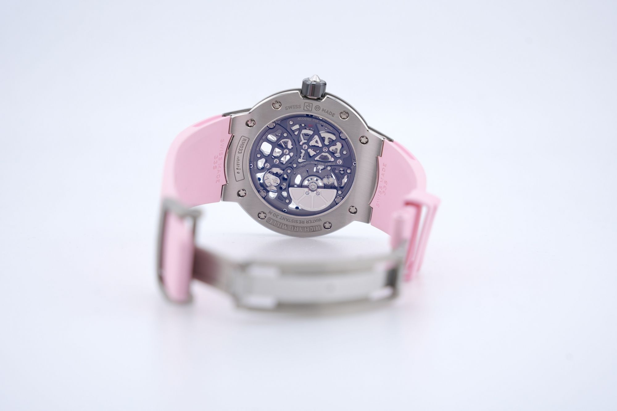 Despite its slim silhouette, the RM033 maintains the brand’s uncompromising standards of performance and craftsmanship. The automatic movement, visible through the sapphire case back, ensures impeccable accuracy and aesthetic refinement.