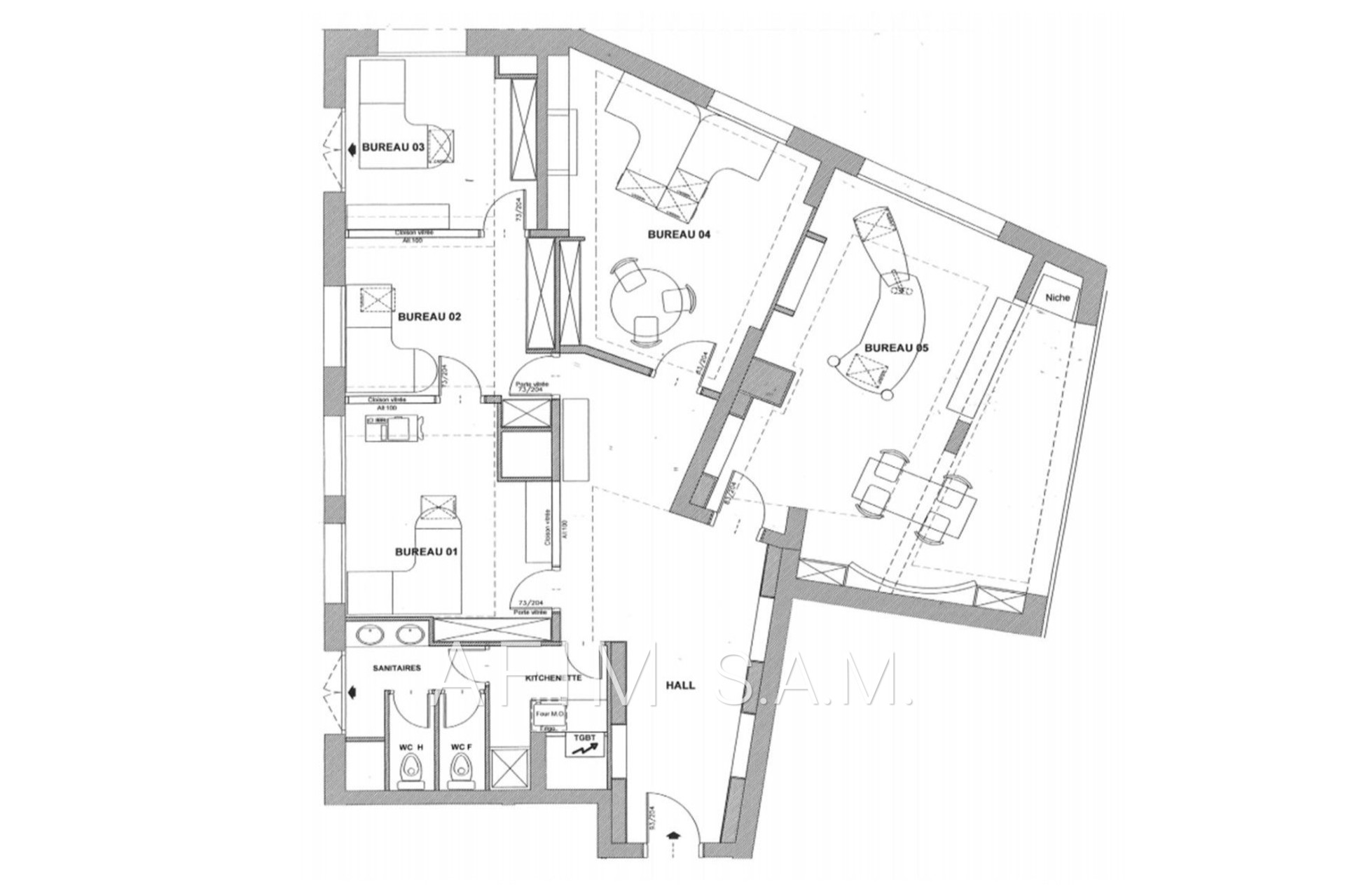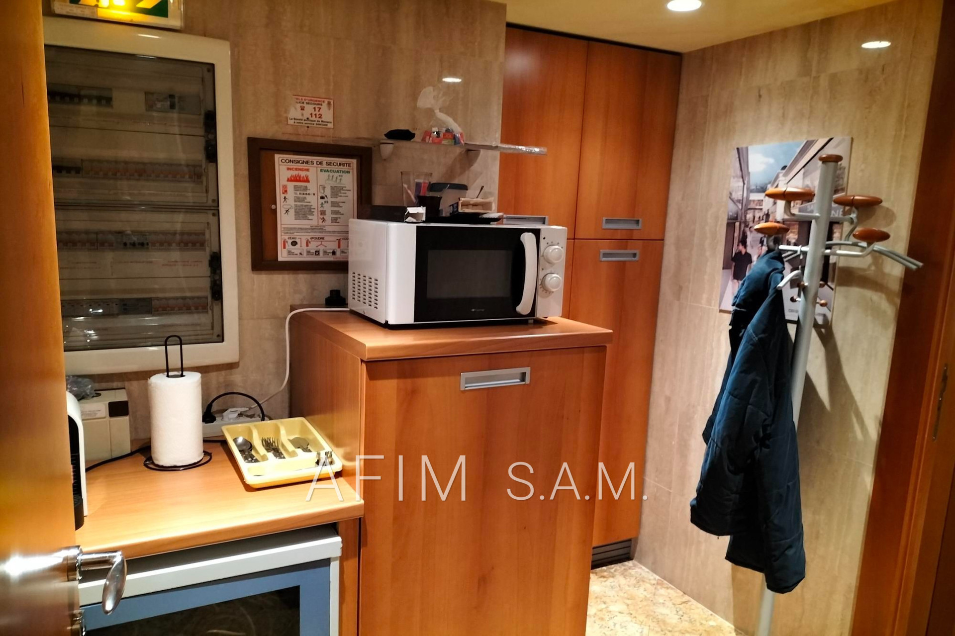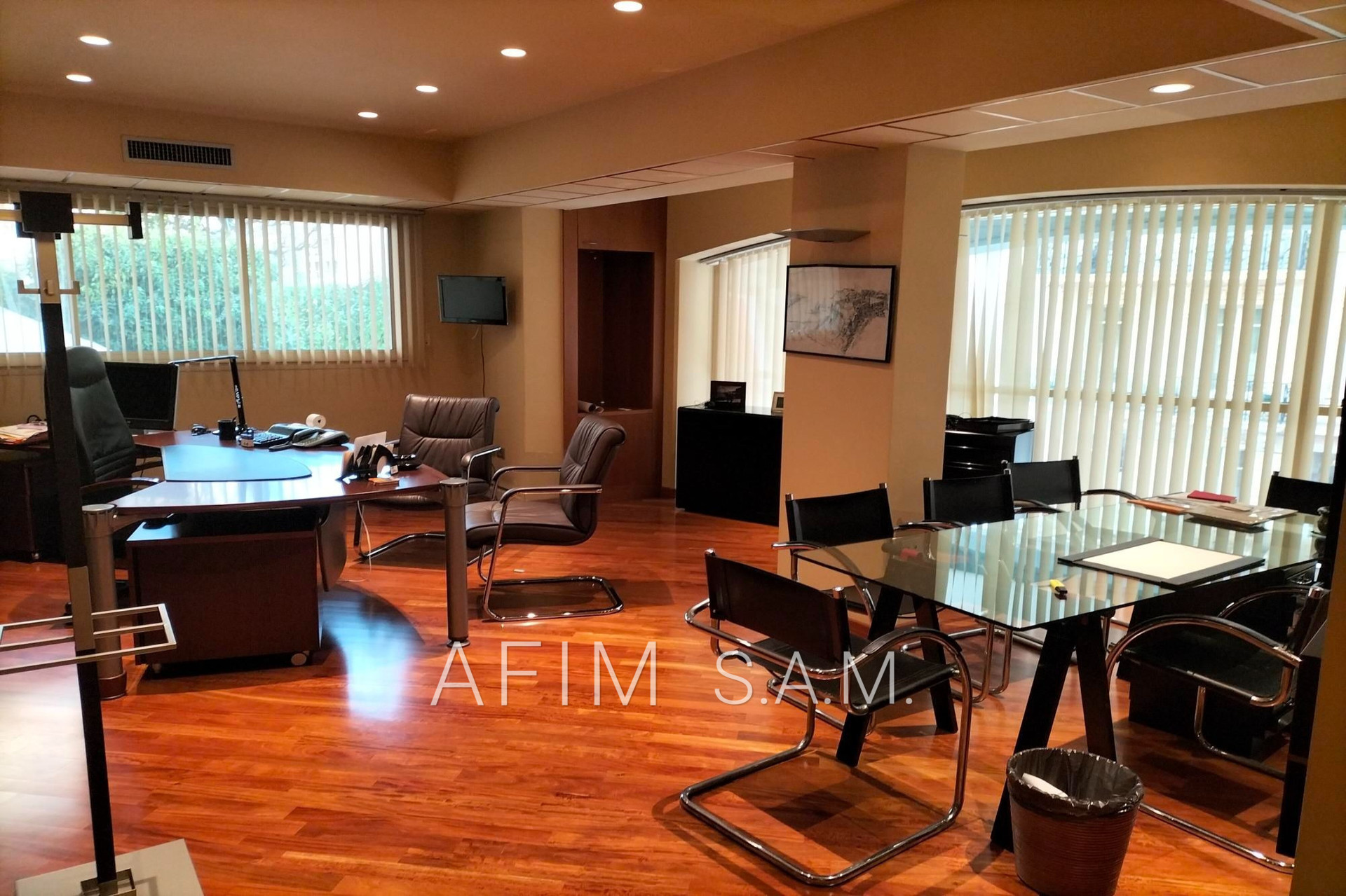 Grand bureau offrant 5 zones de travail, dans le quartier de Monte Carlo. Ces locaux de standing, agencés et décorés avec goût sont loués avec le mobilier : bureaux, chaises, tables, armoires, kitchenette.