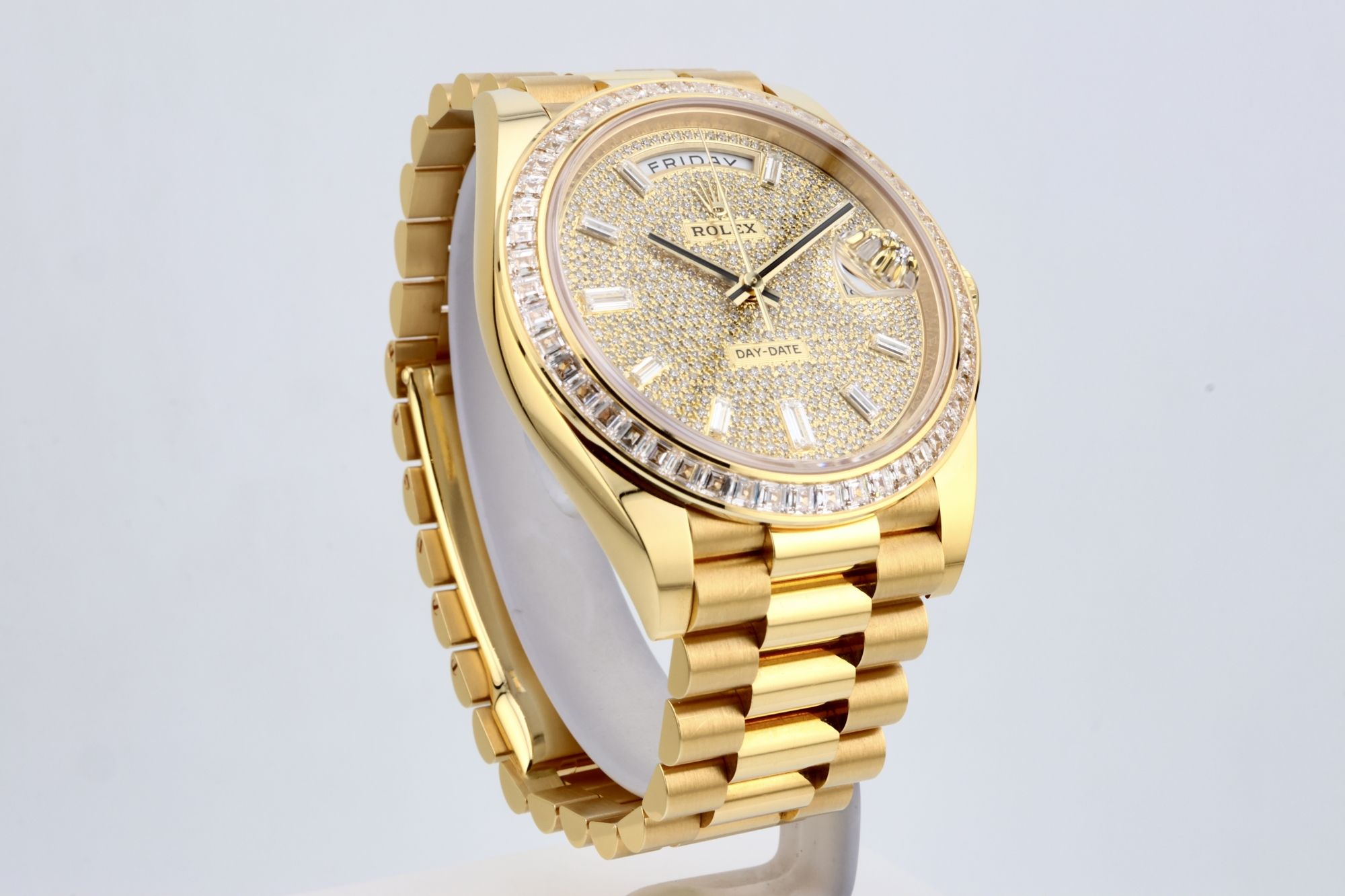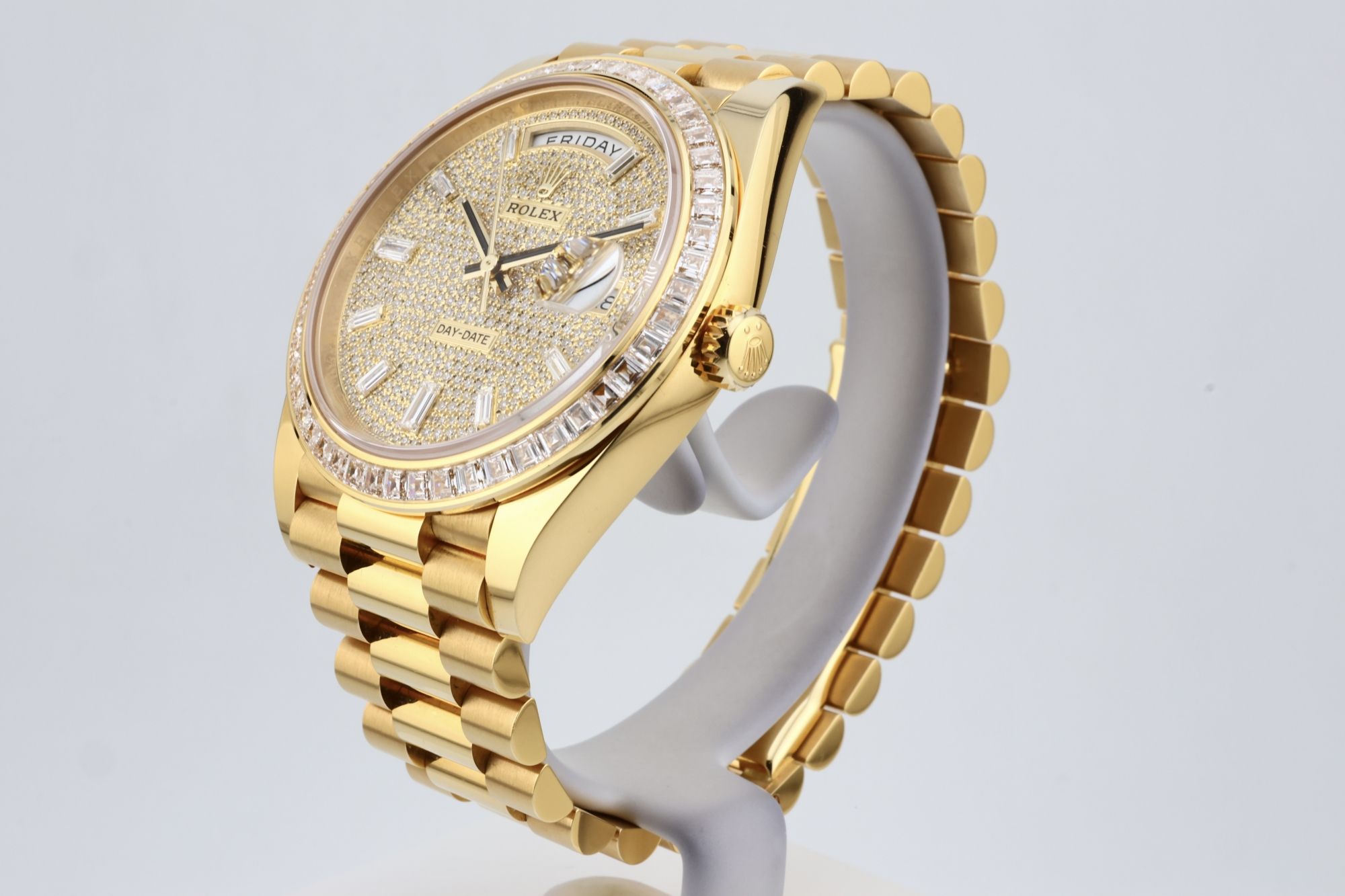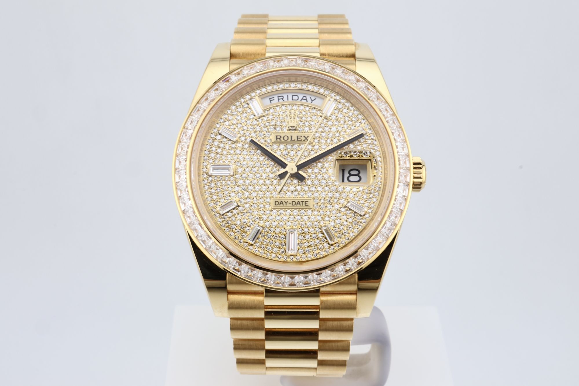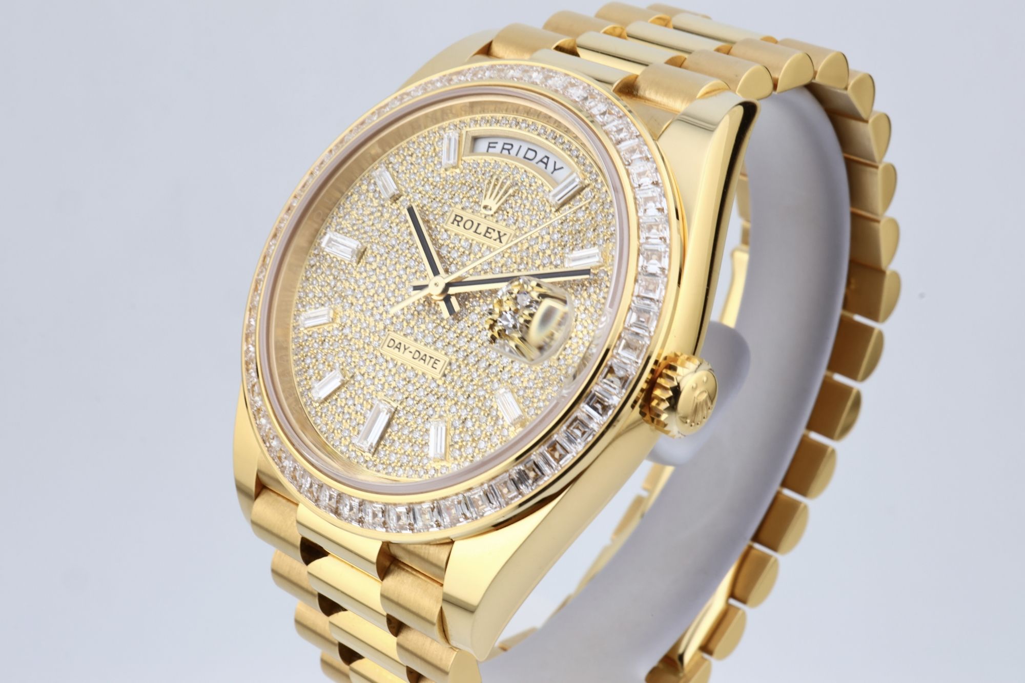 The Rolex Day-Date 40 Ref. 228398TBR represents the pinnacle of prestige and craftsmanship. Crafted in 18K yellow gold, this masterpiece features a diamond-set bezel and the iconic Day-Date display — symbols of timeless sophistication and exclusivity.