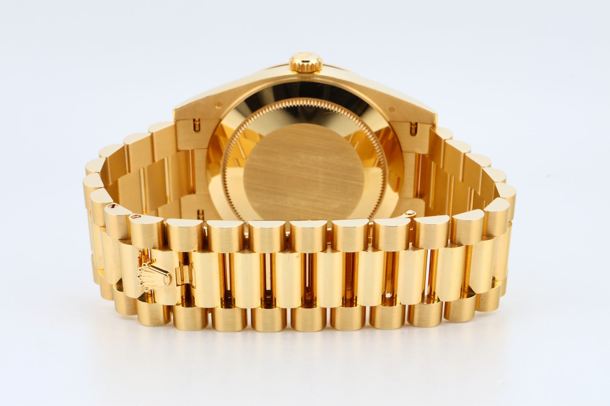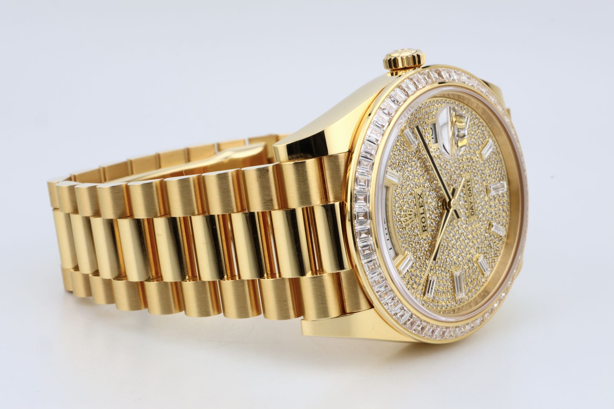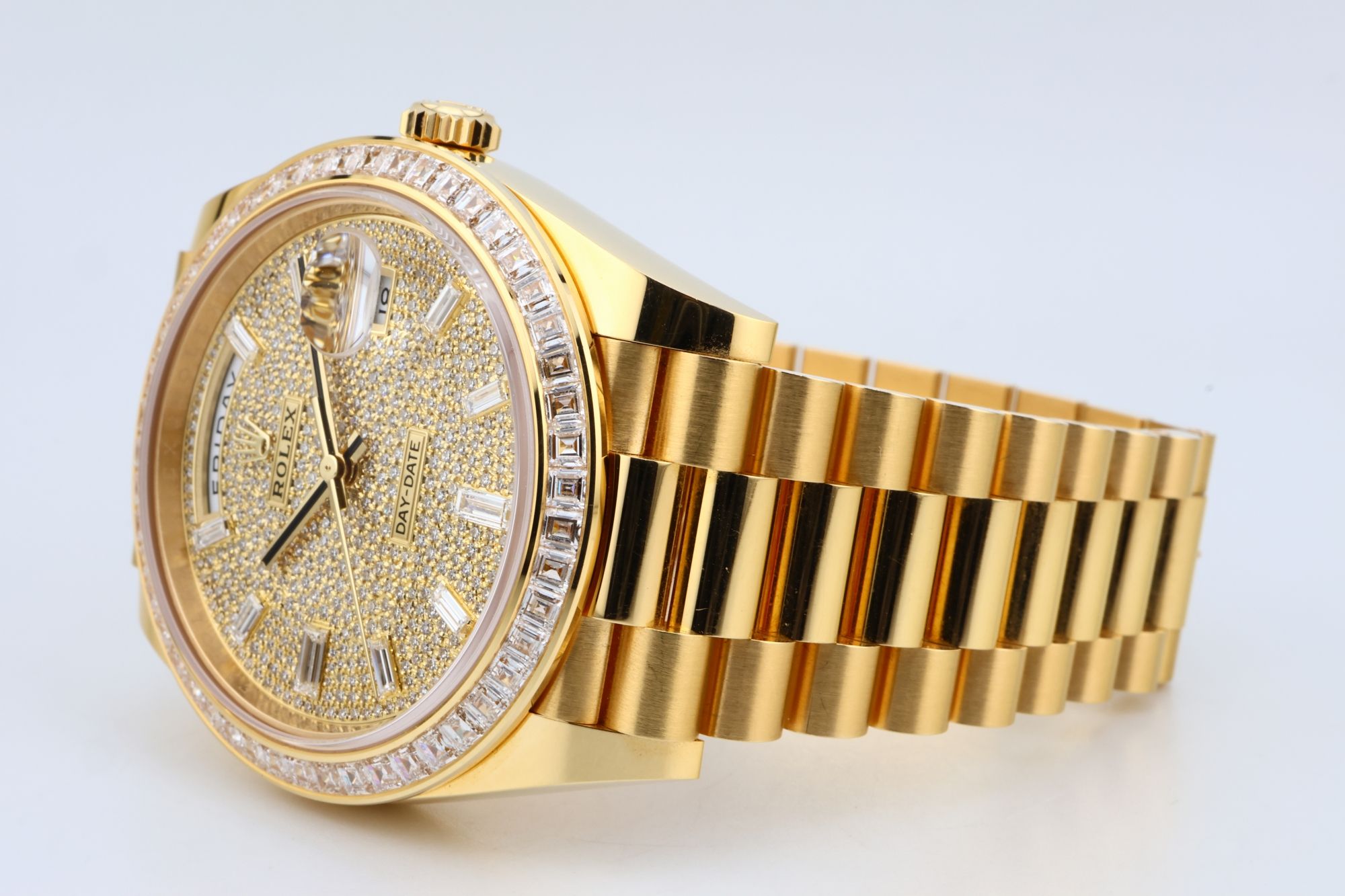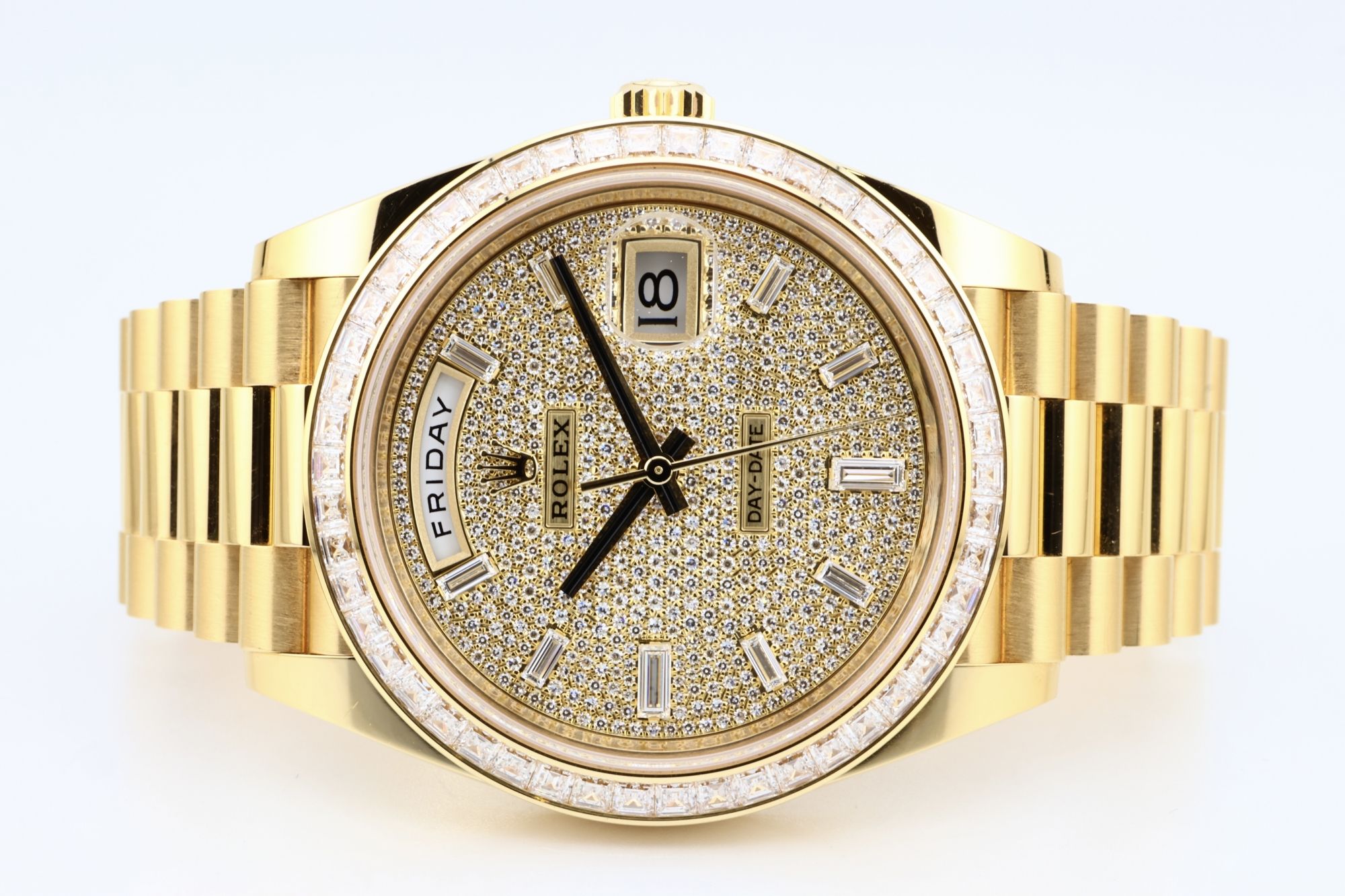 The Rolex Day-Date 40 Ref. 228398TBR represents the pinnacle of prestige and craftsmanship. Crafted in 18K yellow gold, this masterpiece features a diamond-set bezel and the iconic Day-Date display — symbols of timeless sophistication and exclusivity.