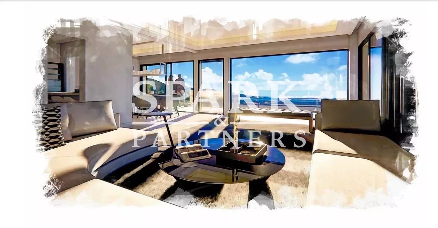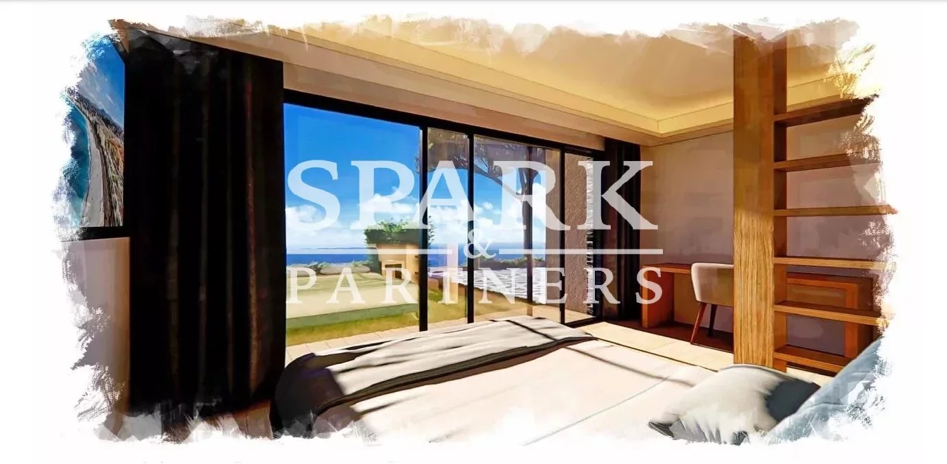The first level features a living room with open-plan kitchen, also equipped with a central island. Master bedroom en suite with bathroom and dressing room.