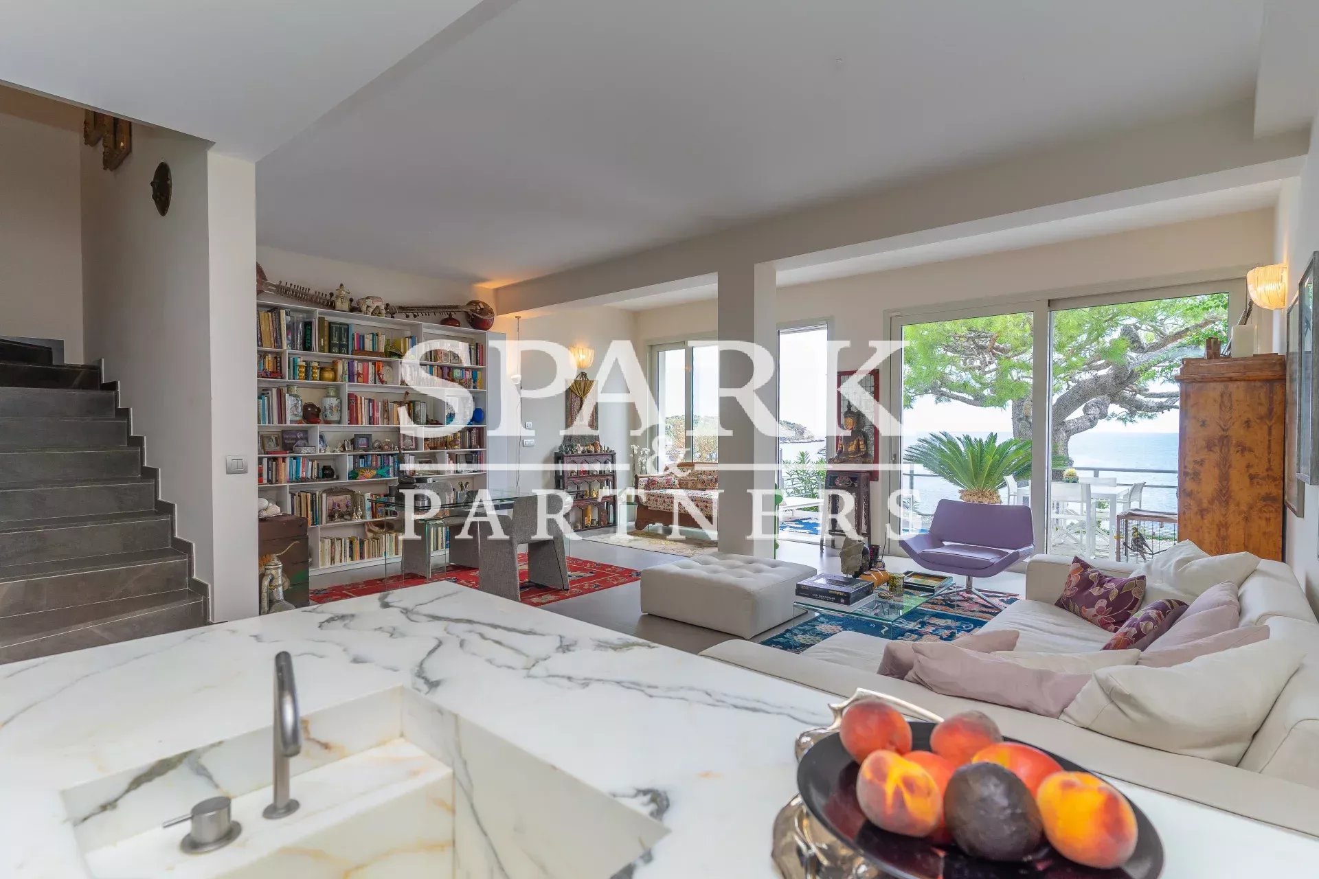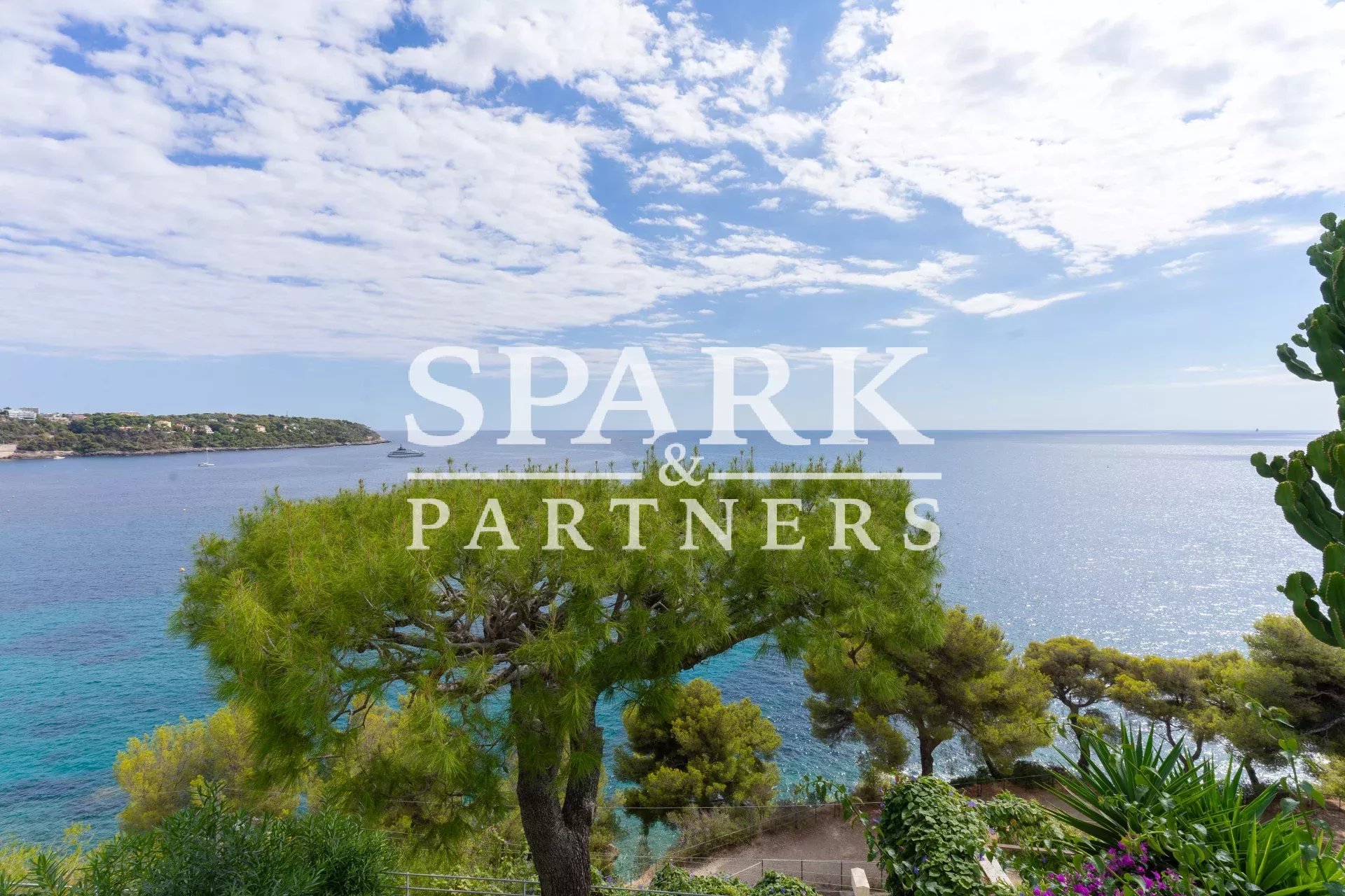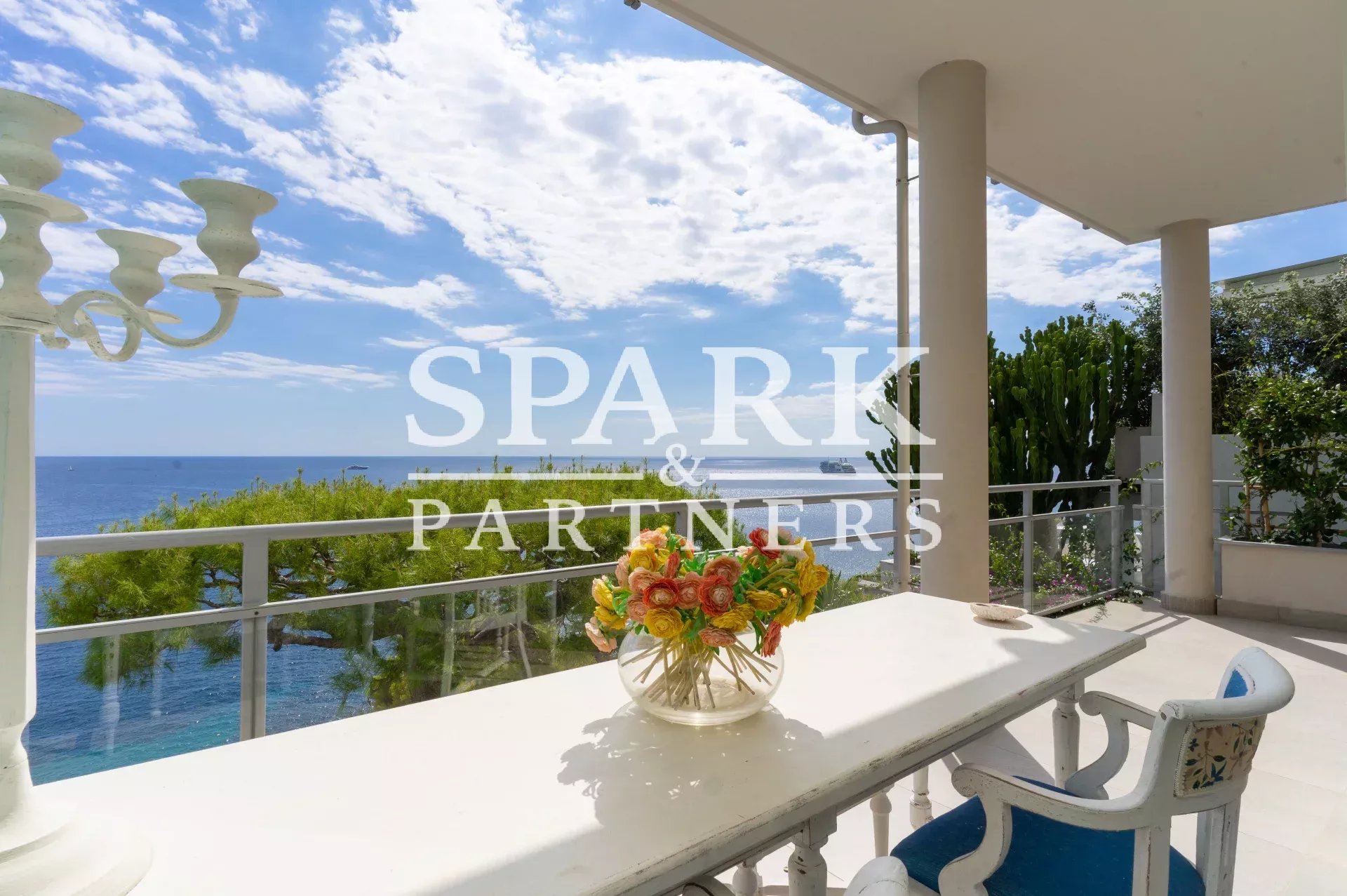 With breathtaking sea views, the apartment comprises an entrance hall, a large living room with bay windows opening onto a terrace and garden, a kitchenette, a laundry room, two bedrooms with en-suite shower rooms.