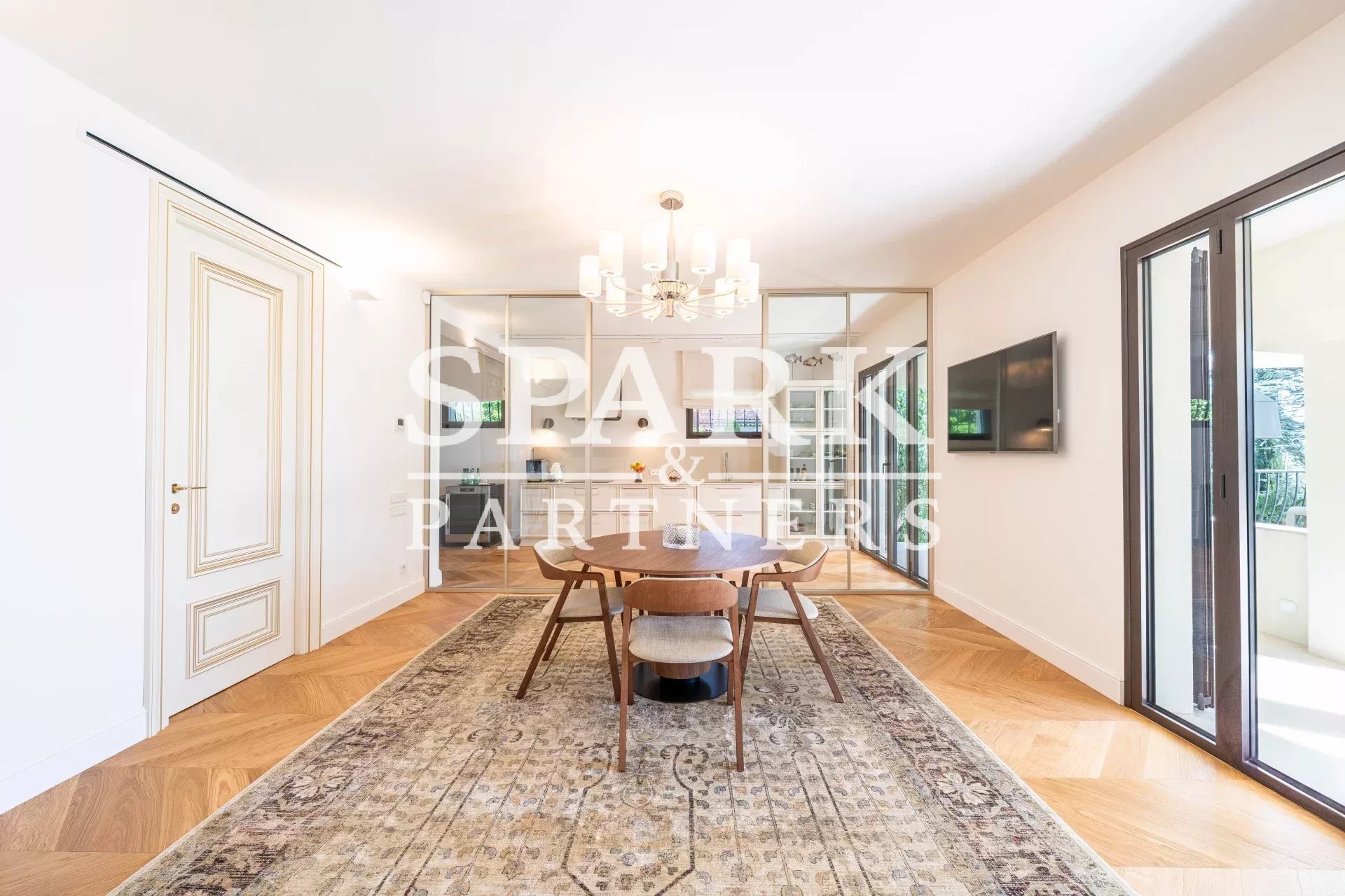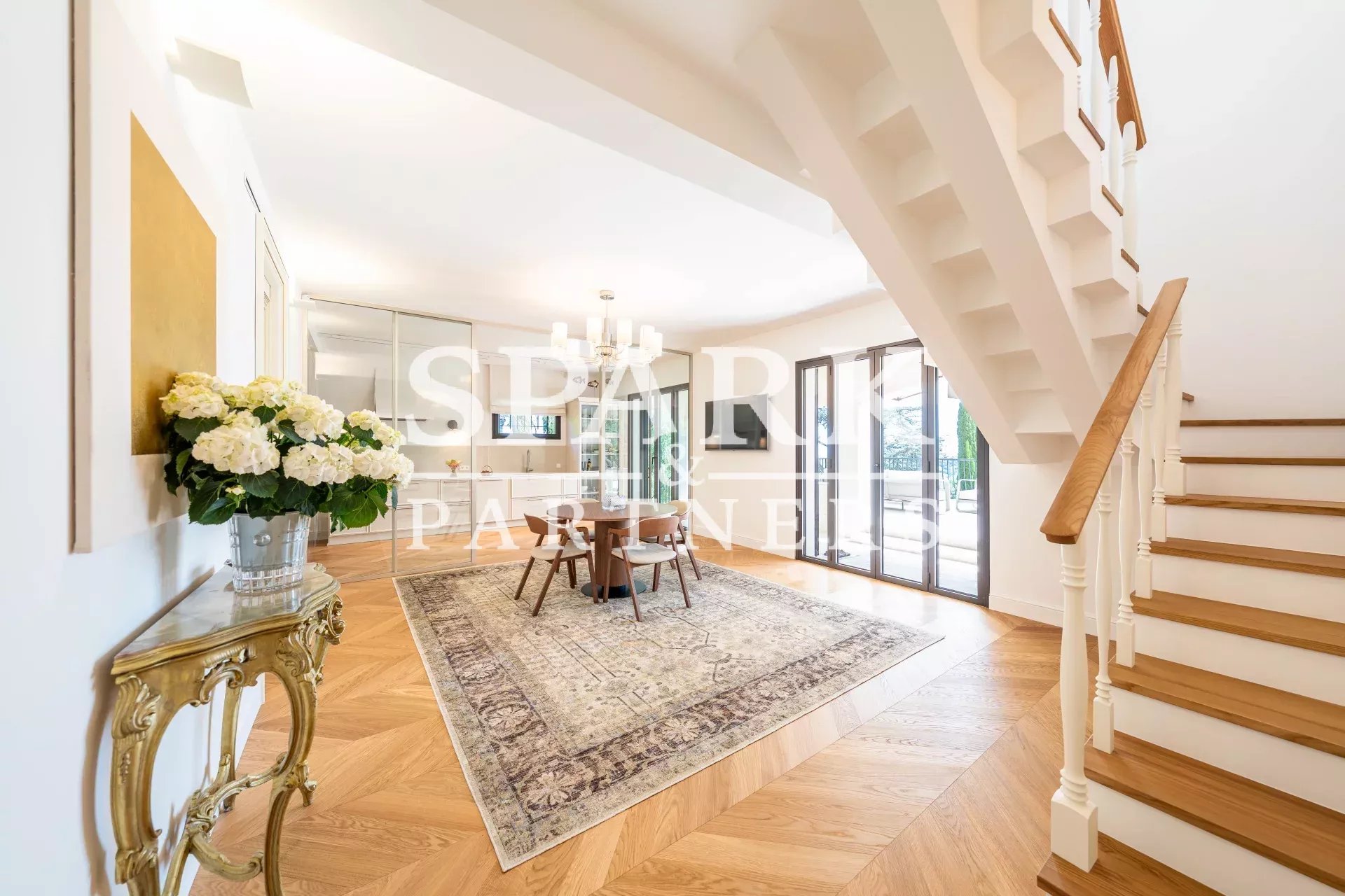 On the garden level, you’ll find an elegant dining room with open kitchen, two additional bedrooms and two shower rooms.