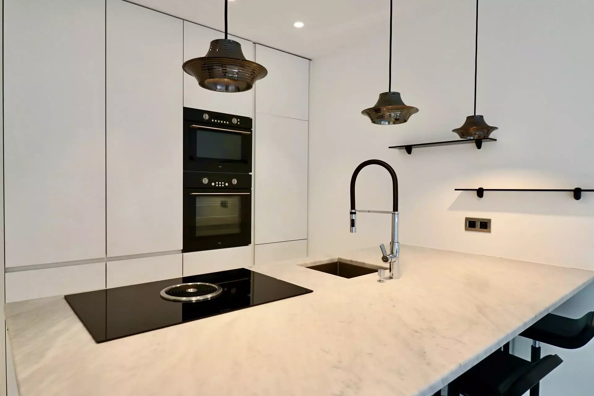 The layout features an inviting entrance hall with built-in closets and a guest toilet, a bright living area with large bay windows, and a modern open-plan kitchen equipped with high-end appliances. The spacious bedroom includes a custom dressing area and connects to a sleek, contemporary shower room finished with premium materials.