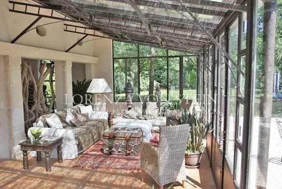 The main house of approximately 1,000 m² exudes refined charm with elegant reception areas, high ceilings, and direct access to sun-drenched terraces. The interiors feature marble floors, fireplaces, and a professional kitchen, complemented by a wine cellar perfect for connoisseurs.