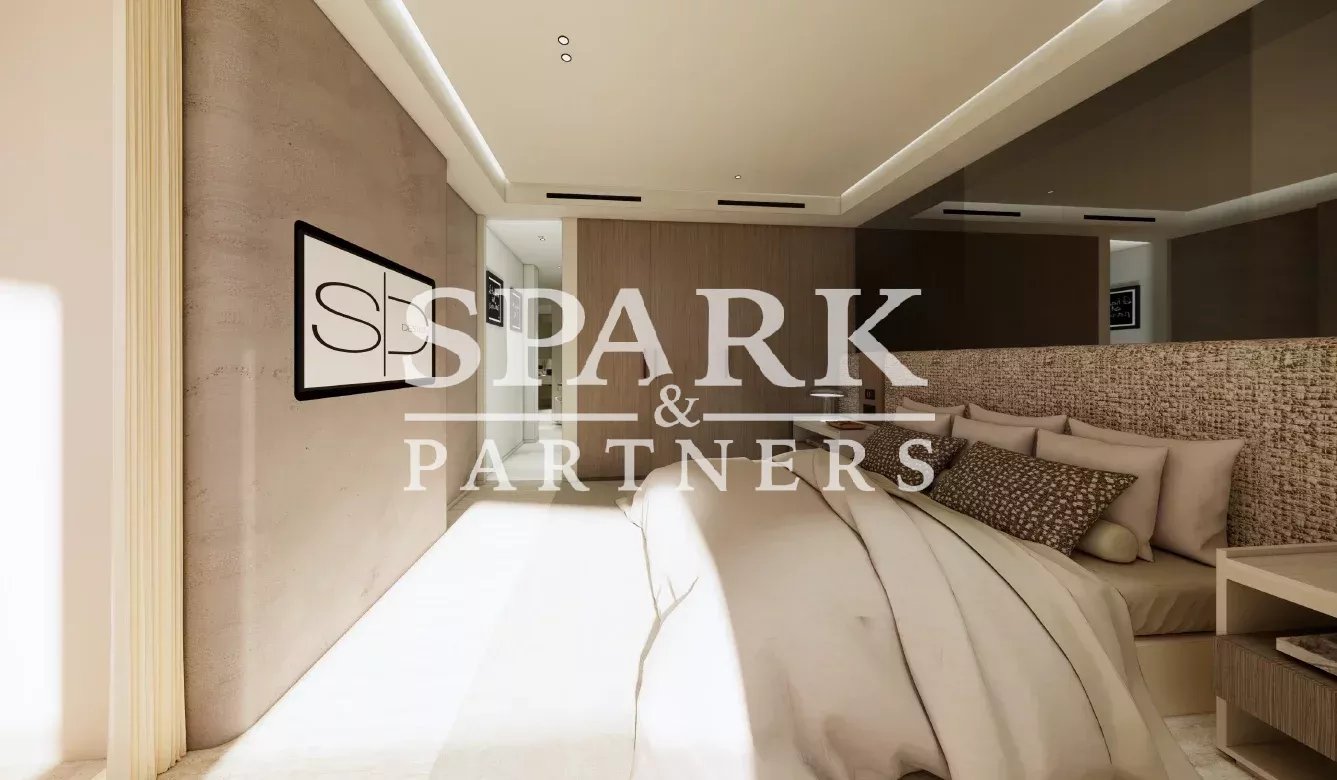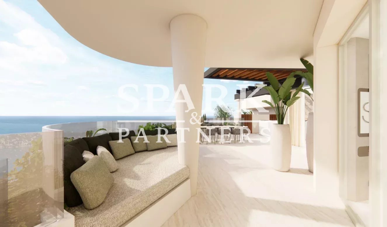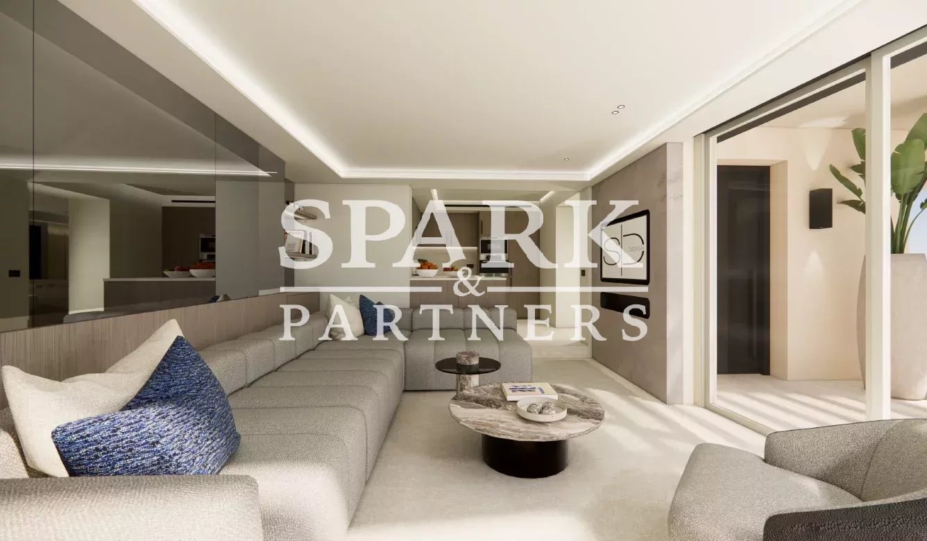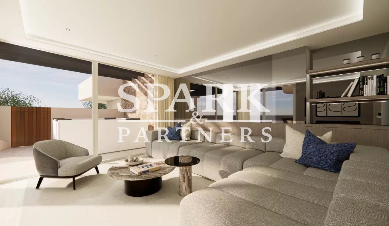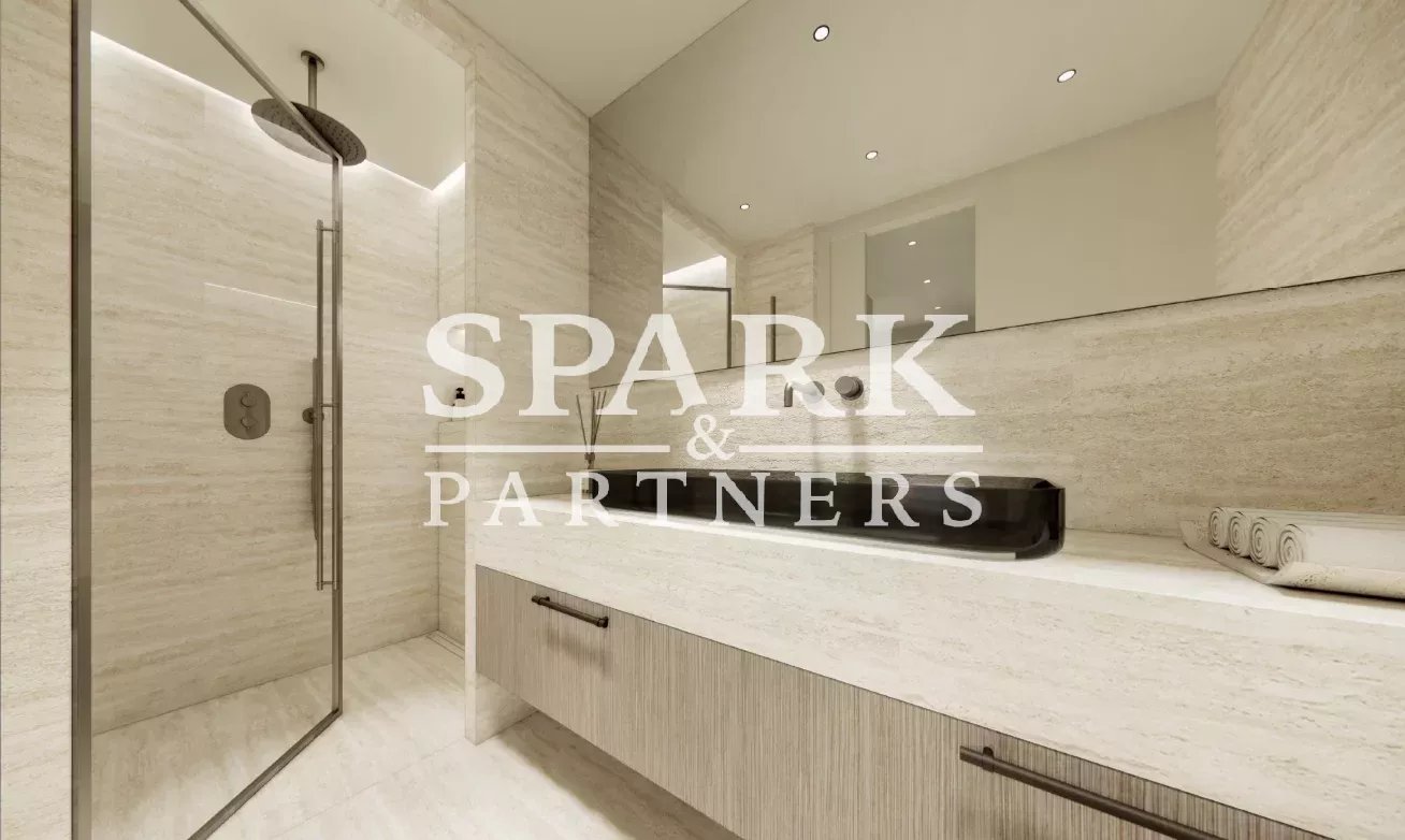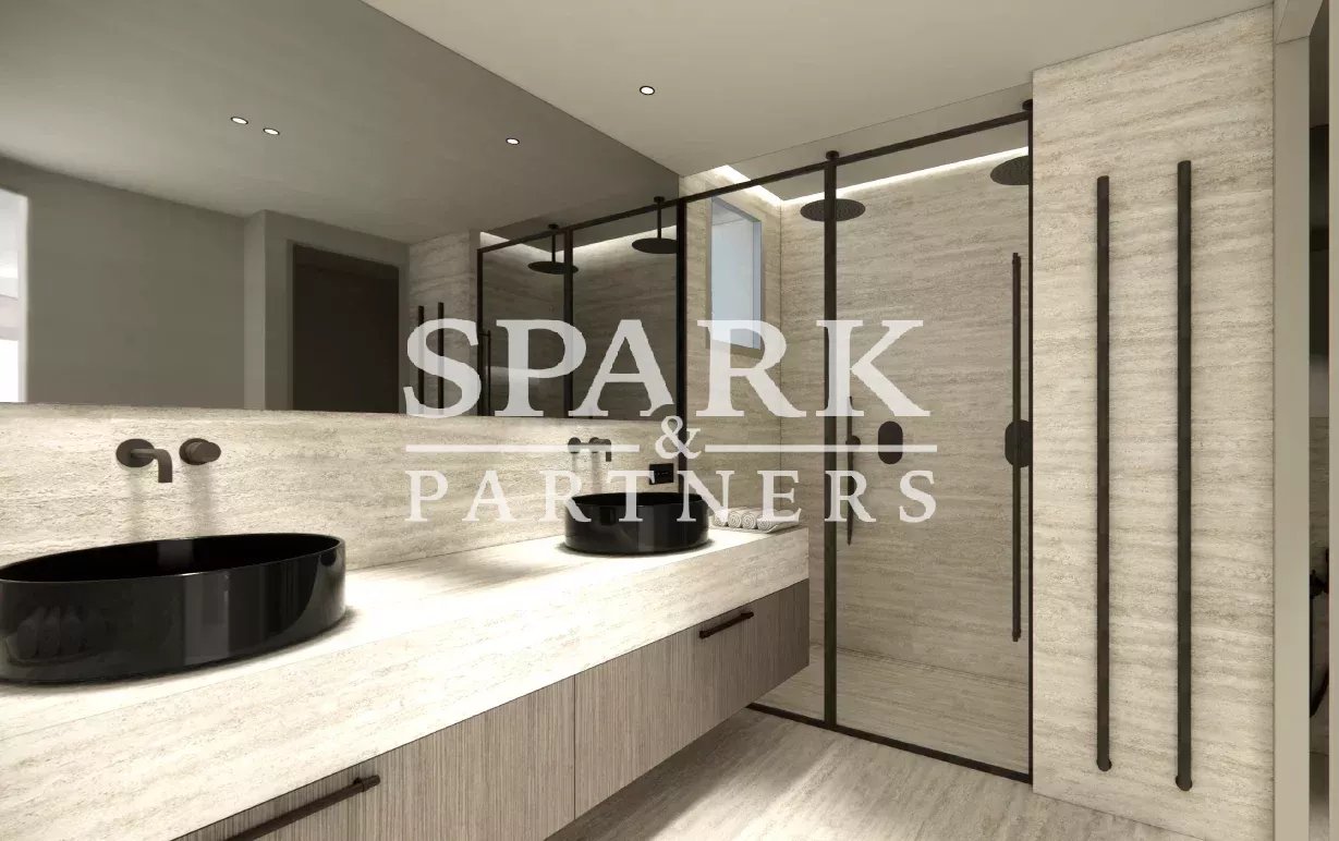 It comprises an entrance hall, a bright living room with open kitchen, 2 elegant bedrooms, 2 modern bathrooms, a storeroom that can be converted into a sauna (optional extra), a guest toilet and a spacious terrace for relaxing in the open air.