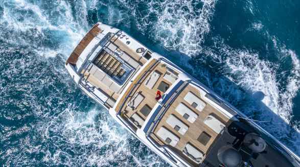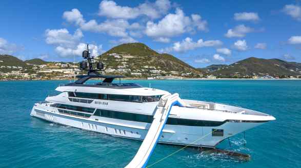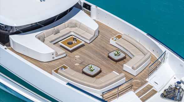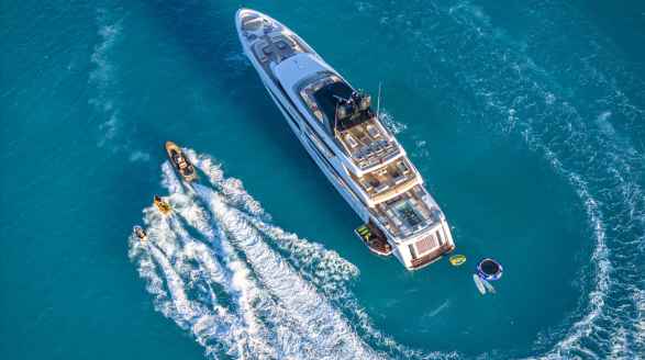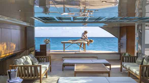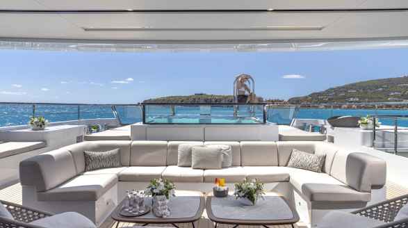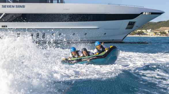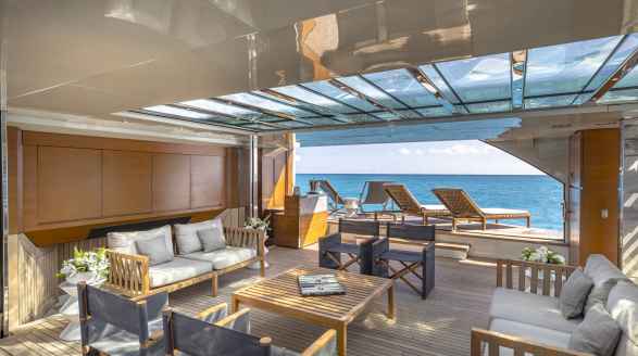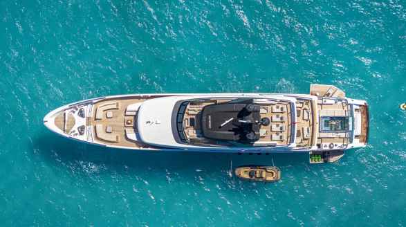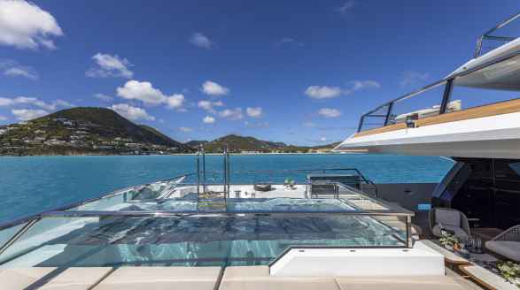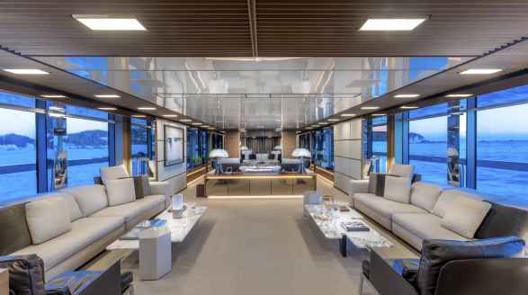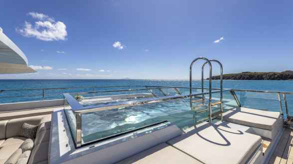 SEVEN SINS, launched by Sanlorenzo in 2017, is a multi-award-winning yacht designed for unparalleled ocean living. A spectacular beach club opens directly onto the sea, complete with gym, sauna, and fold-down terraces. The glass-bottom pool above features counterflow current, Jacuzzi mode, and designer lighting for unforgettable days at anchor.