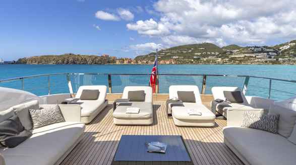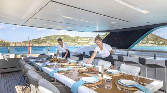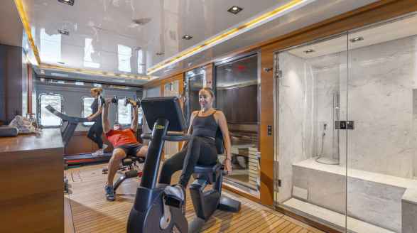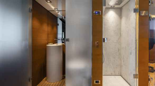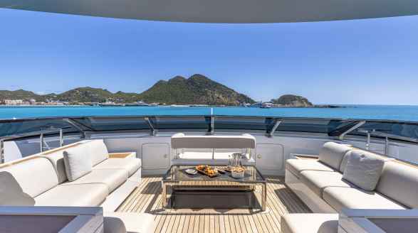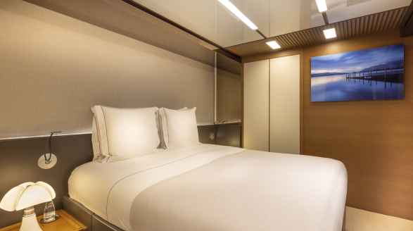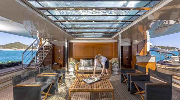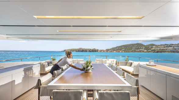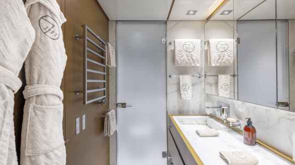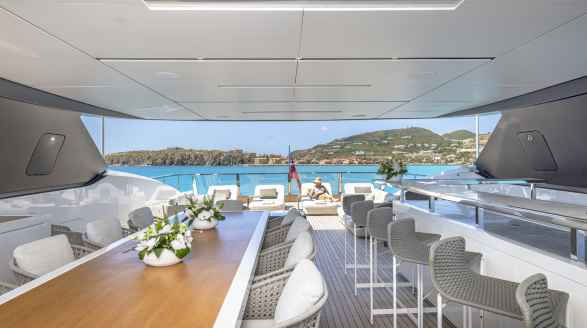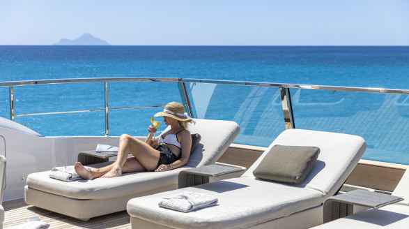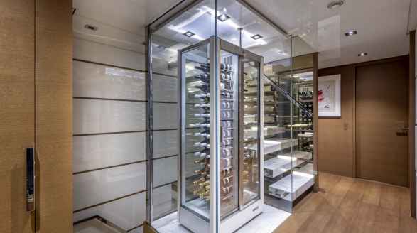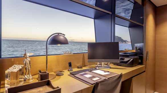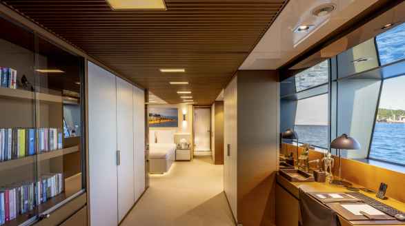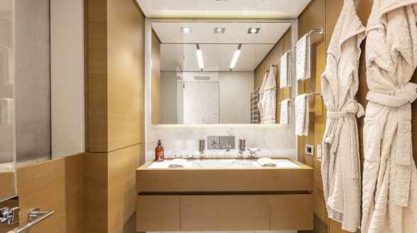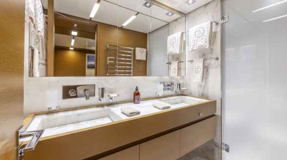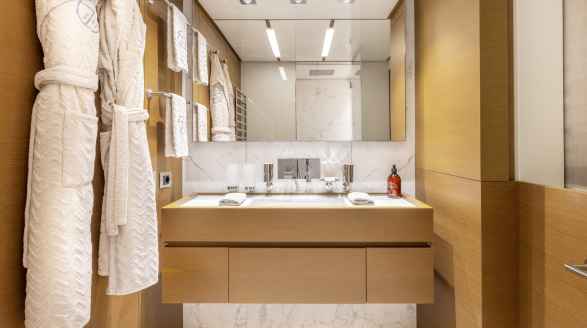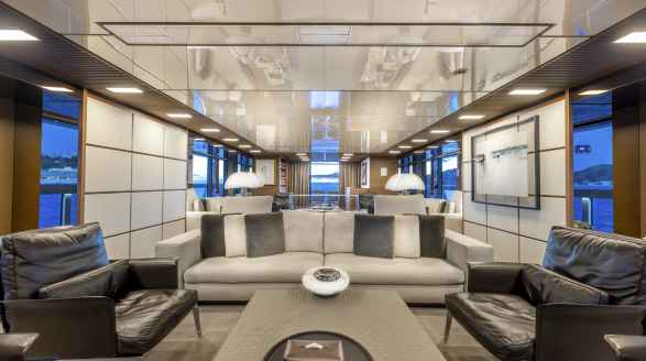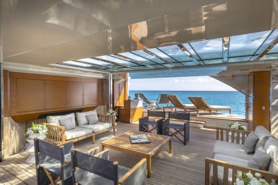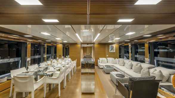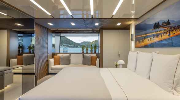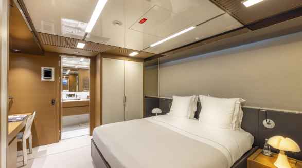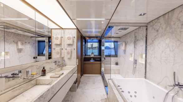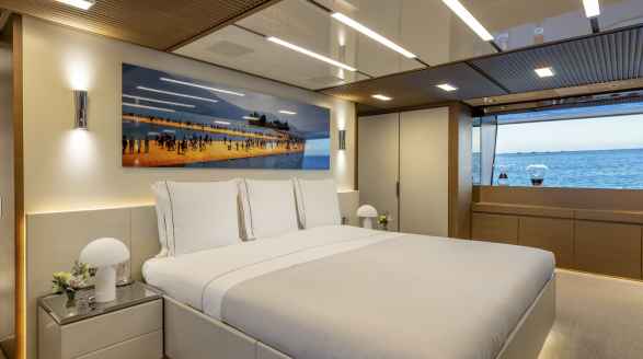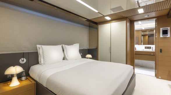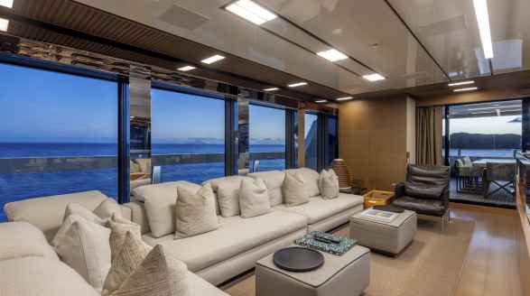 Her interiors are flooded with natural light thanks to extensive glasswork, while the main salon’s floor-to-ceiling windows provide panoramic views. She accommodates 11 guests in five beautifully appointed suites, attended by an experienced crew of 11.